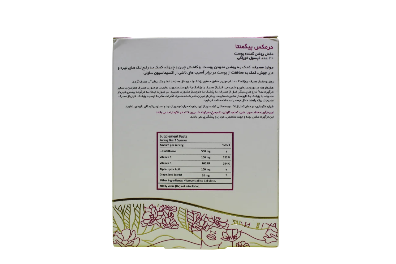 کپسول درمکس پیگمنتا یک مکمل تخصصی روشنکننده پوست است که با ترکیبی از گلوتاتیون، آلفا لیپوئیک اسید، ویتامینهای C و E و عصاره هسته انگور به کاهش لکهای پوستی و یکنواخت شدن رنگ پوست کمک میکند.
