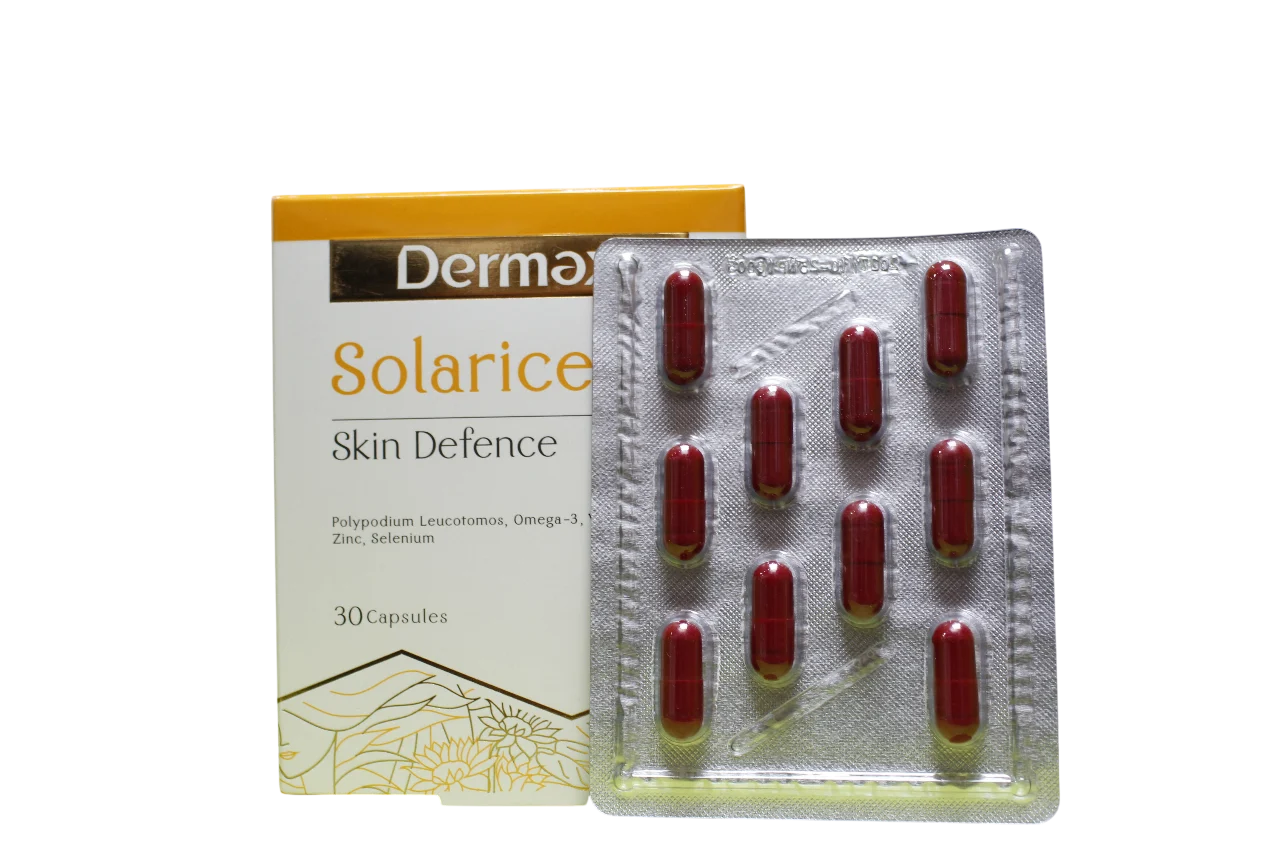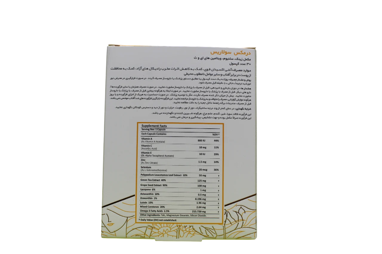 کپسول درمکس سولاریس یک مکمل تخصصی برای محافظت از پوست در برابر آسیبهای ناشی از نور خورشید است که به کاهش اثرات مخرب اشعههای UVA و UVB کمک میکند.