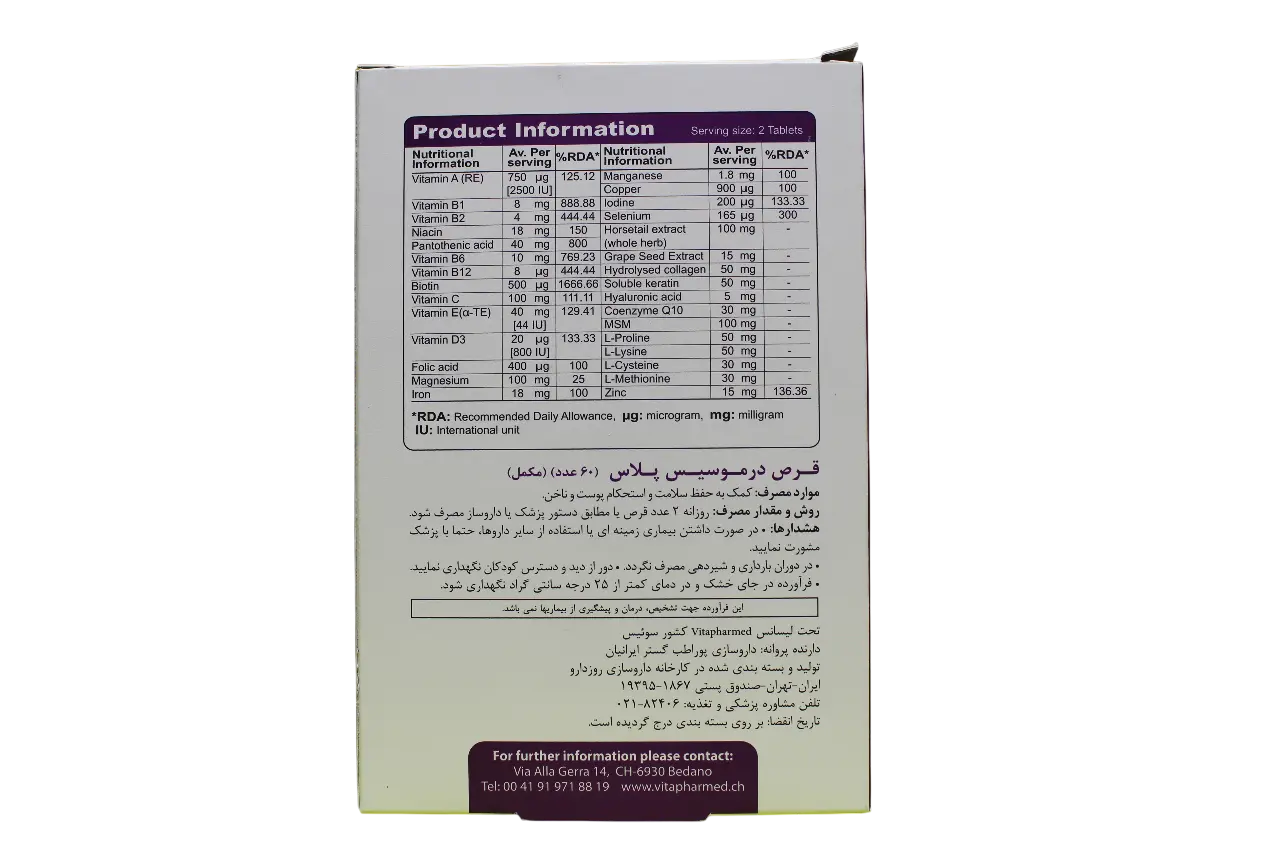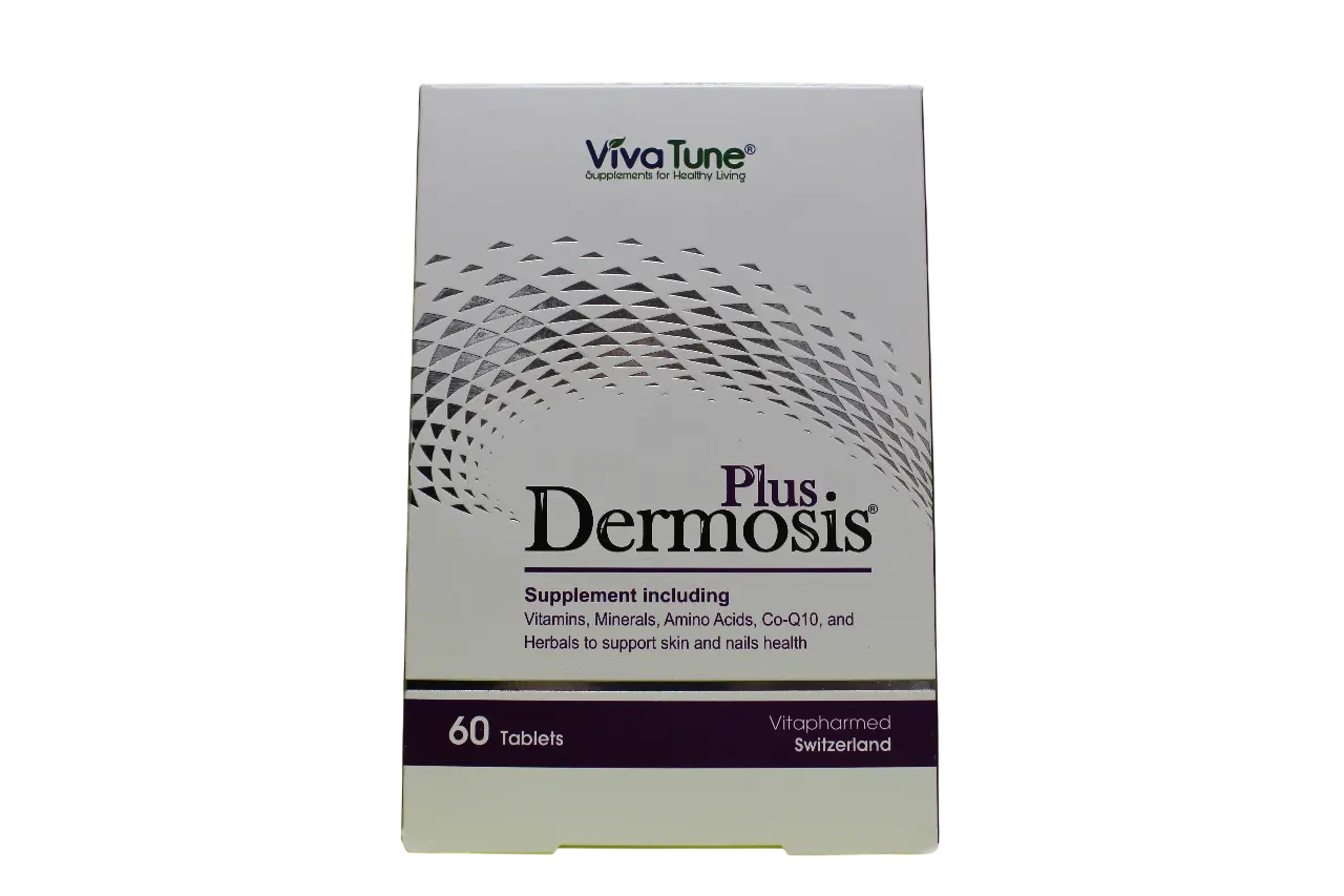 قرص درموسیس پلاس (Dermosis Plus) یک مکمل تخصصی برای حفظ سلامت پوست و ناخن است که توسط برند VivaTune و تحت لیسانس Vitapharmed سوئیس تولید شده است. این محصول با فرمولاسیونی غنی از ویتامینها، مواد معدنی، آمینواسیدها، کوآنزیم Q10 و ترکیبات گیاهی، به بهبود کیفیت پوست و تقویت ناخنها کمک میکند.