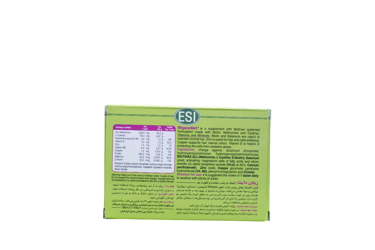 قرص ریجندایت رتارد ESI یک مکمل تخصصی برای تقویت مو و کاهش ریزش مو است که با فرمولاسیون آهسته‌رهش (Retard) طراحی شده تا مواد مغذی به‌تدریج در طول روز در اختیار فولیکول‌های مو قرار بگیرد. این محصول حاوی ترکیب اختصاصی Biotinax به همراه ویتامین‌ها و مواد معدنی ضروری برای تغذیه مو از ریشه است.